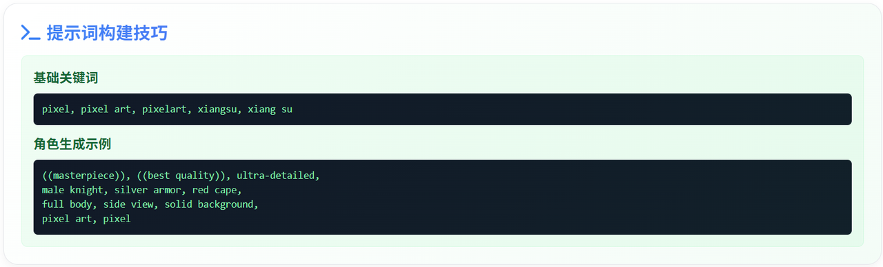 Pixel Art Simplified采用了不同的技术路线,其设计理念是提供一个轻量化、易于使用的像素风格模型。该模型的优势在于文件体积小、加载速度快,特别适合快速原型设计和 UI 图标生成等场景。然而,由于其简化的设计,在复杂的游戏素材生成方面能力有限,无法像 2D Pixel Toolkit 那样提供全面的游戏元素支持。