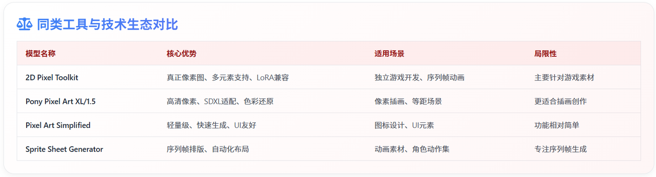 在 AI 像素艺术生成领域,除了 2D Pixel Toolkit 之外,还有许多优秀的 LoRA 模型和专门工具。通过对比分析,可以更好地理解 2D Pixel Toolkit 的技术定位和竞争优势。