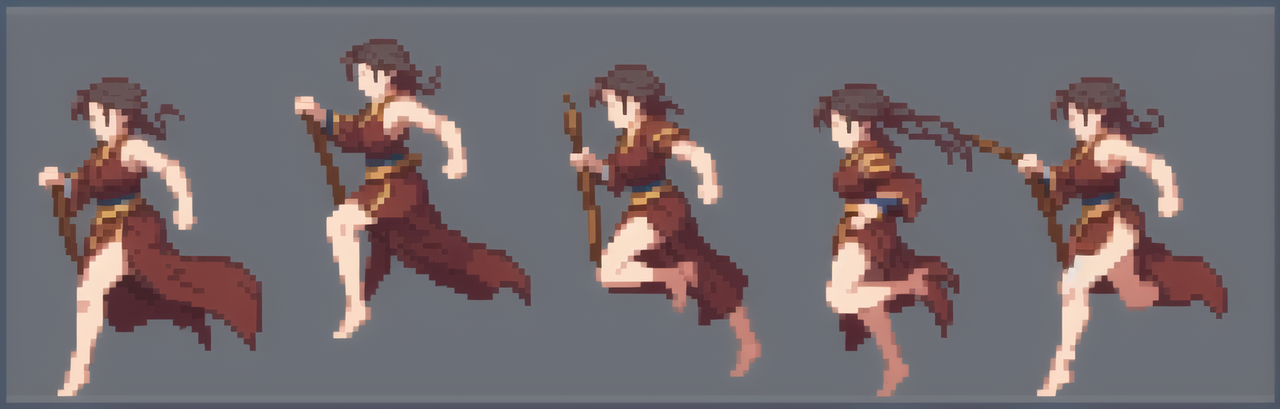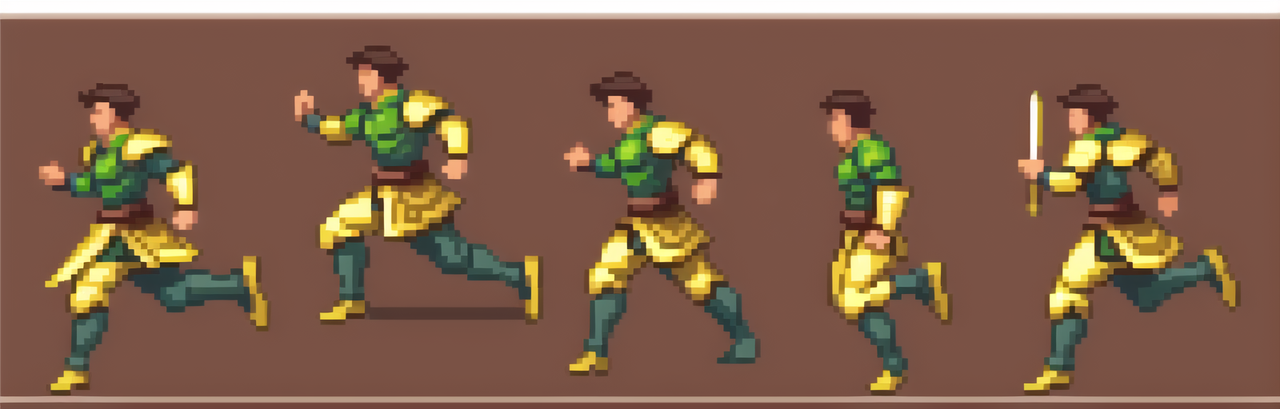 Sprite Sheet Generator LoRA则专注于序列帧动画的生成,其最大特点是能够原生支持 sprite sheet(精灵图)格式的生成和排版。这一特性使其在动画制作领域具有独特优势,用户无需手动拼接即可直接获得用于游戏开发的序列帧素材。然而,该模型在独立角色和道具生成方面的能力相对较弱,功能较为单一。