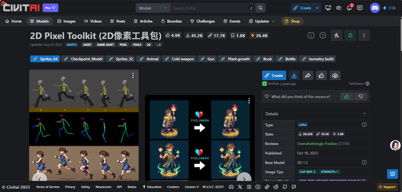 Pony Pixel Art XL/1.5是另一个备受关注的像素风格 LoRA 模型,由 Creative Hot IA 开发。该模型的主要优势在于其对 SDXL(Stable Diffusion XL) 的良好适配性,能够生成更高分辨率的像素图像(116)。与 2D Pixel Toolkit 相比,Pony Pixel Art 在色彩还原度和细节表现方面具有一定优势,特别适合需要精细色彩控制的插画创作场景。然而,该模型在游戏素材的专业性方面不如 2D Pixel Toolkit 全面,特别是在序列帧动画生成方面的功能相对有限。