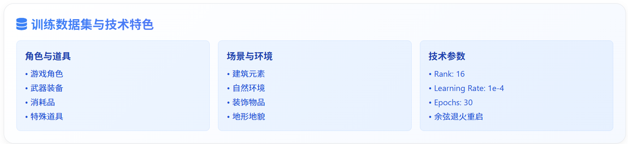 对于 2D Pixel Toolkit 而言,该模型针对独立游戏常用的像素元素进行了定向训练,包括角色、武器、道具、场景和序列帧等核心游戏素材。训练过程中,模型学习到了像素艺术的关键特征:边缘清晰、像素格严格对齐、无模糊和色彩污染,这些特征确保了生成图像的专业性和可用性。