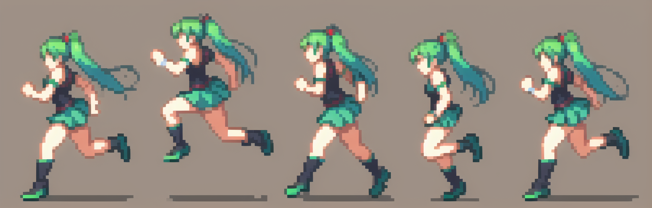 pixel,pixel art,pixelart,xiangsu,xiang su,full body,(((solid background))),1Girl,miku,Double ponytail,Hatsune Miku,skirt,side view,running,sequence frames,masterpiece,best,quality,
