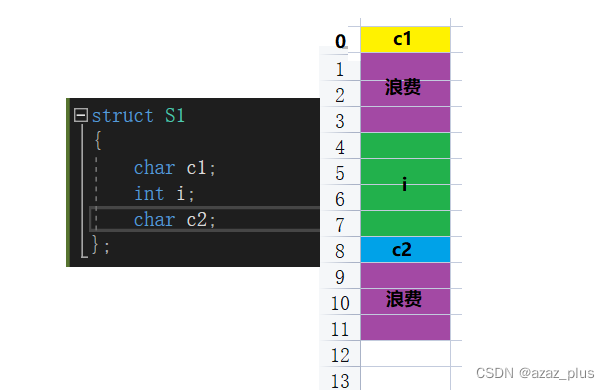 从0开始存储c1,然后下一个i是Int类型,大小是4(小于vs的最大对齐数),但是存储完c1之后的下一个偏移量是1,不是4的倍数,因此要浪费一些空间来找到int的偏移量,然后从偏移量为4开始存储,存四个字节之后再继续,存完i之后的偏移量为8,是char的整数倍,因此在下一个存储8 ,然后所有的对齐数最大的是4,因此对吼的总大小应该是4的整数倍,所以答案是12。