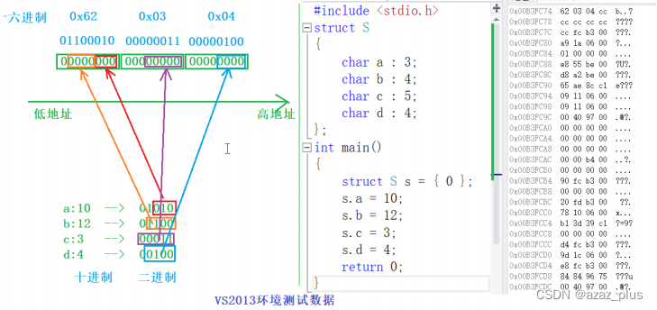 我们不妨通过一个栗子来详细的研究一下关于位段的内存空间开辟(这里以小端存储为栗)
