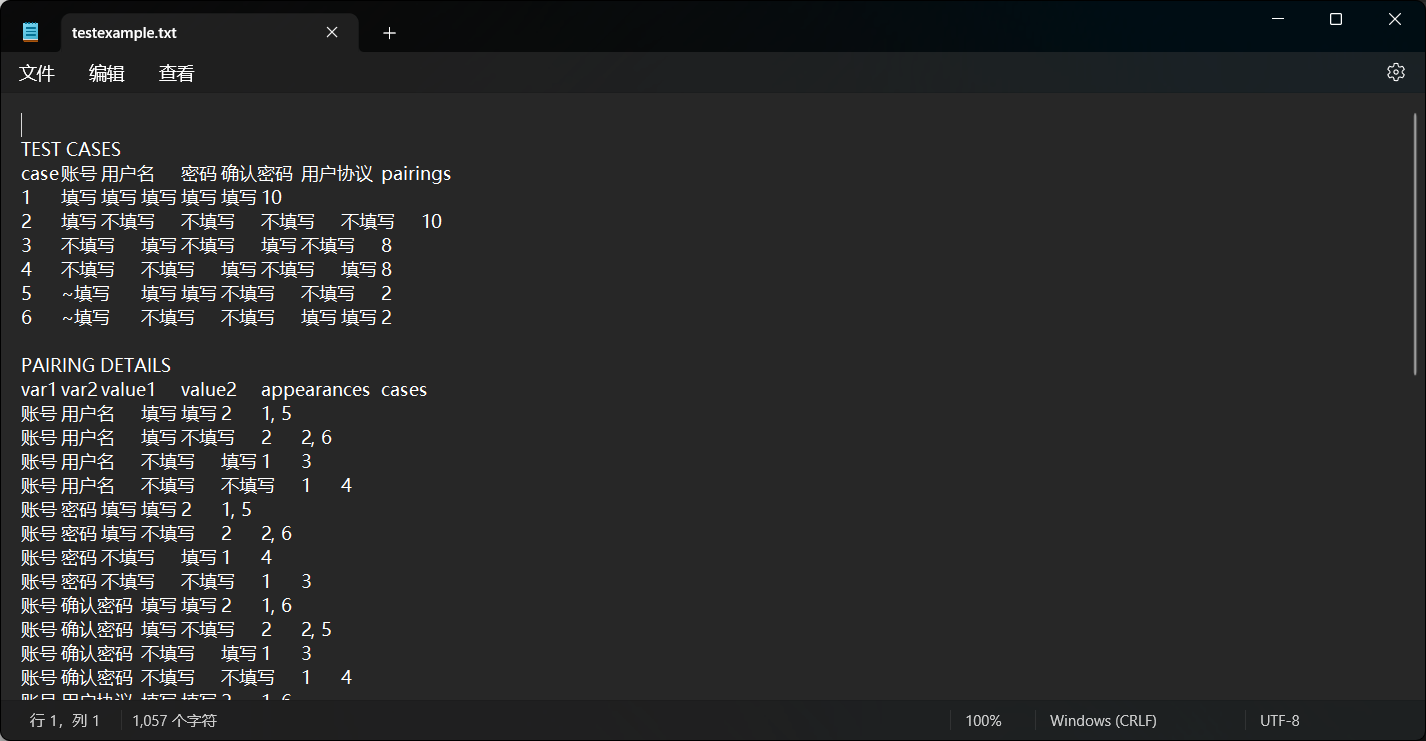 之后我们在allpairs路径下打开生成的testexample.txt即可看到设计的用例