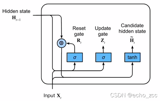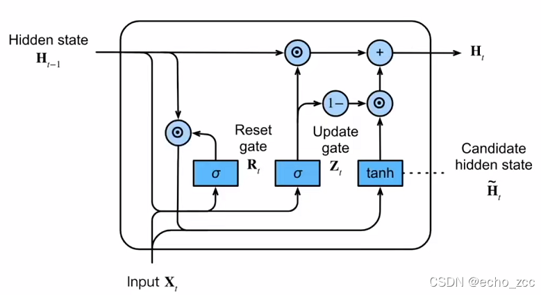 隐状态:Ht=Zt⨀Ht−1+(1−Zt)⨀H~tH_t=Z_t\bigodot{H_{t-1}+(1-Z_t)\bigodot{\tilde{H}_t}}Ht=Zt⨀Ht−1+(1−Zt)⨀H~t