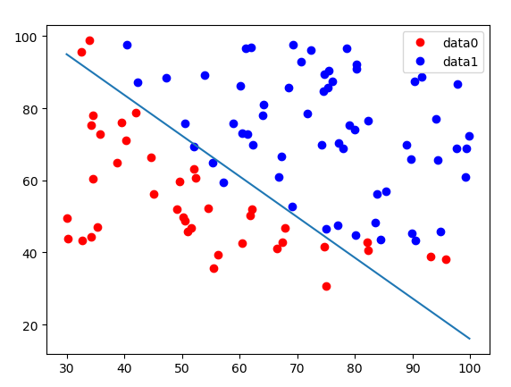 import numpy as np import torch import torch.optim as optim import torch.nn as nn import matplotlib.pyplot as plt import os data = np.genfromtxt("data.txt",delimiter=",",dtype=np.float32) data0 = data[data[:,2]==0.] data1 = data[data[:,2]==1.] data0_x = data0[:,0] data0_y = data0[:,1] data1_x = data1[:,0] data1_y = data1[:,1] class LogisticRegression(nn.Module): def __init__(self): super(LogisticRegression, self).__init__() self.linear = nn.Linear(2,1) self.sigmoid = nn.Sigmoid() def forward(self,x): x = self.linear(x) out = self.sigmoid(x) return out model = LogisticRegression().cuda() criterion = nn.MSELoss() optimizer = optim.SGD(model.parameters(), lr=1e-3,momentum=0.9) for epoch in range(50000): x = torch.from_numpy(data[:,0:2]).cuda() y = torch.from_numpy(data[:,2]).unsqueeze(1).cuda() output = model(x) loss = criterion(output,y) print_loss = loss.item() mask = output.ge(0.5).float() correct = (mask == y).sum() total = x.size(0) accuracy = correct.item() / total optimizer.zero_grad() loss.backward() optimizer.step() if (epoch+1) % 100 == 0: print('*'*10) print("epoch[{}/{}]".format(epoch+1, 50000)) print("loss: {:.6f}".format(print_loss)) print("accuracy: {:.4f}".format(accuracy)) w0,w1 = model.linear.weight[0] w0,w1 = w0.item(),w1.item() b = model.linear.bias.item() plot_x = np.arange(30,100,0.1) plot_y = (-w0 * plot_x - b) / w1 plt.plot(data0_x,data0_y,"ro", label="data0") plt.plot(data1_x,data1_y,"bo", label="data1") plt.plot(plot_x, plot_y) plt.legend(loc="best") plt.show()
