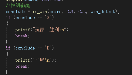 这样子永远都进入不了if的选择语句之中,需要先给conclude赋值在判断,我猜测这个问题归结于C语言的底层逻辑,is_win能够return里面的字符串,但是不能直接拿来和单字符比较,必须要先赋值才可以。
