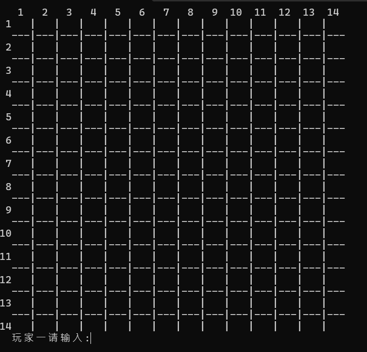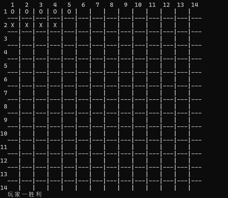 现在我们依次让玩家输入(1,1)(1,2)(1,3)(1,4)(1,5)来看看执行的效果