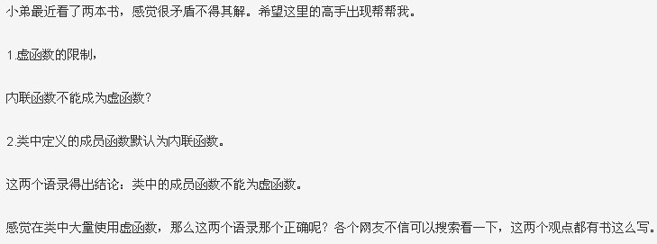 在类中定义并实现的成员函数默认为inline(内联)函数,而Inline函数又不能为虚函数,这是两个正确的结论,这位同学的疑惑是这两个