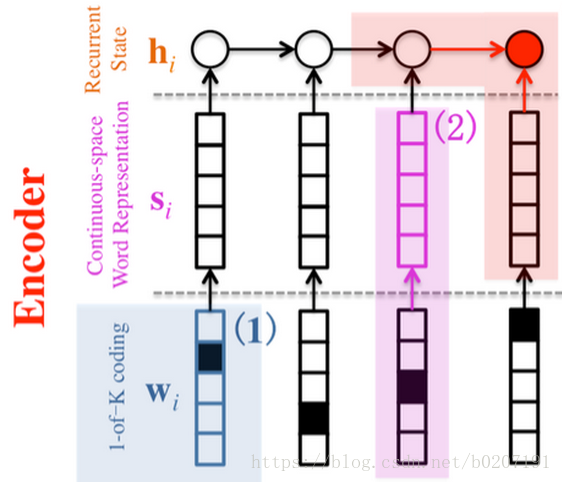 两个 Recurrent Neural Networks (RNNs) 递归神经网络。一个用来处理输入的文本 (encoder network),一个用来生成翻译后的文本 (decoder network)。它们一个负责编码,将源语言编码成向量,一个负责解码,将向量解码为目标语言。其优点在于可以从生数据中学习特征,将语义相同句子汇聚,不同句子分开,还有利于LTSM捕获长距离依赖,解决稀疏问题。(启示:因为RNN可以处理变长输入和变长输出,还具有记忆功能)如下图所示,为了生成编码(橙色),我们将句子输入到RNN中,一次一个词(红色)。最后一个词处理之后的最终结果(橙色),就将是表示整个句子的数值:
