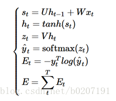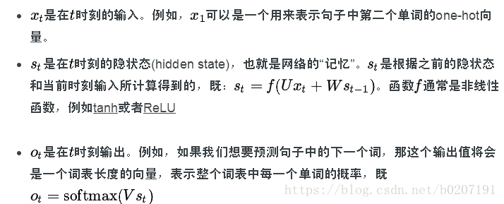 RNN属于生成模型。RNN的训练同样使用BP误差反向传播算法,不过有一点区别。如果将RNN进行网络展开,那么参数是共享的,而传统神经网络却不是的。并且在使用梯度下降算法中,每一步的输出不仅依赖当前步的网络,并且还以来前面若干步网络的状态。该学习算法称为Back propagation Through Time (BPTT)。结合前面RNN的展开图示,定义下面符号