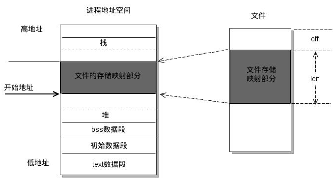 mmap的作用是映射文件描述符和指定文件的(off_t off)区域至调用进程的(addr,addr *len)的内存区域,如下图所示: