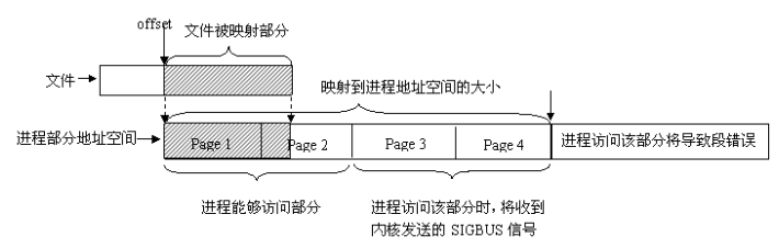 linux采用的是页式管理机制。对于用mmap()映射普通文件来说,进程会在自己的地址空间新增一块空间,空间大小由mmap()的len参数指定,注意,进程并不一定能够对全部新增空间都能进行有效访问。进程能够访问的有效地址大小取决于文件被映射部分的大小。简单的说,能够容纳文件被映射部分大小的最少页面个数决定了进程从mmap()返回的地址开始,能够有效访问的地址空间大小。超过这个空间大小,内核会根据超过的严重程度返回发送不同的信号给进程。可用如下图示说明: