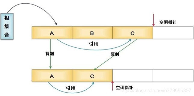 这种算法会将内存划分为两个相等的块,每次只使用其中一块。当这块内存不够使用时,就将还存活的对象复制到另一块内存中,然后把这块内存一次清理掉。这样做的效率比较高,也避免了内存碎片。但是这样内存的可使用空间减半,是个不小的损失。