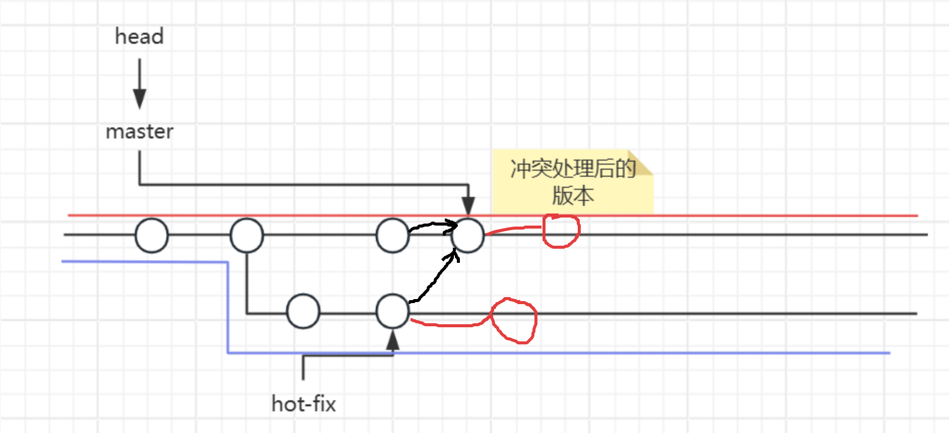 在idea或者其他可视化分支时,如下面,不要被分支merge的线指示迷惑,不是代表hot-fix也有提交合并后的版本。红色部分是之后再在两个分支上各自提交的结果。