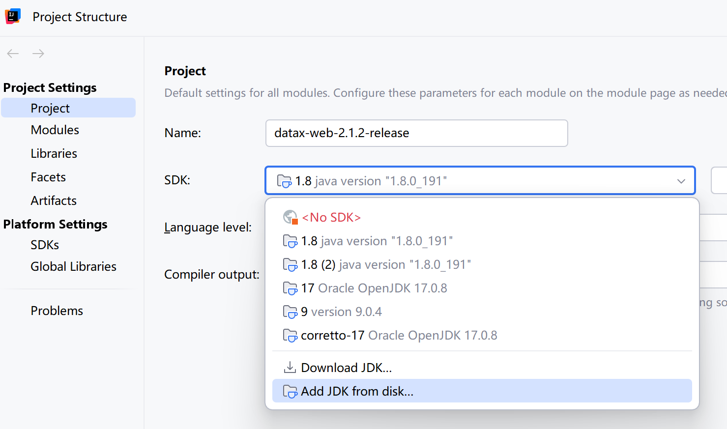当然以上系统环境变量都是基于我们不使用idea然后命令行输入java命令,maven命令就会去找这个路径。但是我们如果在idea中配置了项目的jdk,那就可以共存多个jdk,我们为项目选择对应jdk即可。具体就在file->project structure中,我们可以看到选择sdk是有添加jdk的选项,添加完选这个jdk就实现了自由选择jdk。