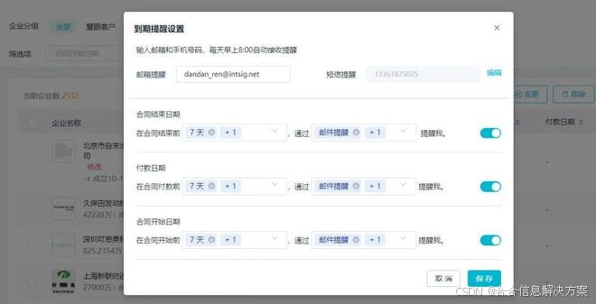 启信慧眼【客户管理】功能为营销部门解决该痛点,提供合同、付款到期前的自动提醒机制,可根据客户实际情况自定义设置提醒机制,如合同结束前30天、付款日期在合同付款前30天通过邮件或短信进行提醒,即可每天早上自动接收提醒。及时对账期客户的应收账款进行催收,降低企业坏账率。