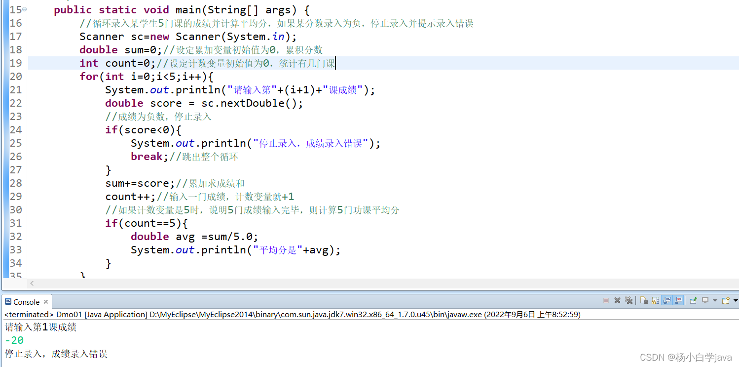 案例:循环录入某同学的5门功课的成绩并计算平均分,如果平均分为负数,停止录入并提示录入错误。