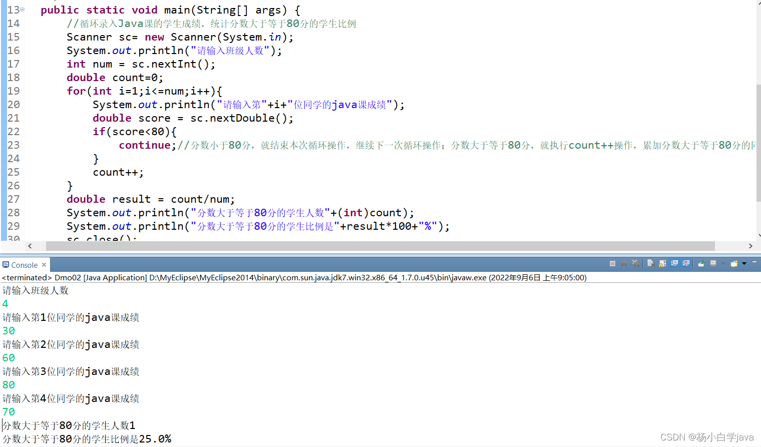 案例:循环录入java课的学生成绩,统计分数大于等于80分的学生比例。