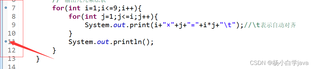 这篇博客记录了作者在学习Java的第九天所学内容,主要包括多重循环的使用,如嵌套循环,并通过案例展示了如何输出特定图形和九九乘法表。此外,还讲解了跳转语句,如break和continue的运用,以及在不同场景下的效果。在程序调试方面,介绍了设置断点和调试步骤来定位和修复bug。