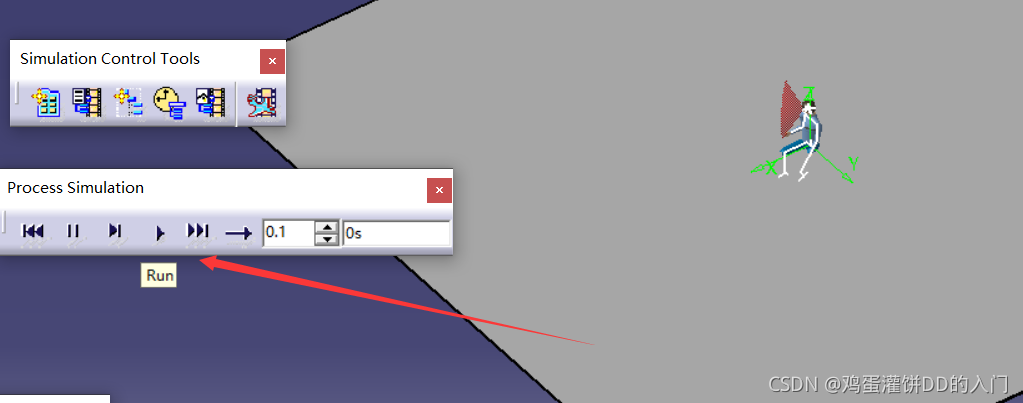 7.设置完成后,点击PPR结构树中的运动名称,点击simulation工具栏中的process simulation按钮弹出如下工具栏,点击run可以运行设置的运动