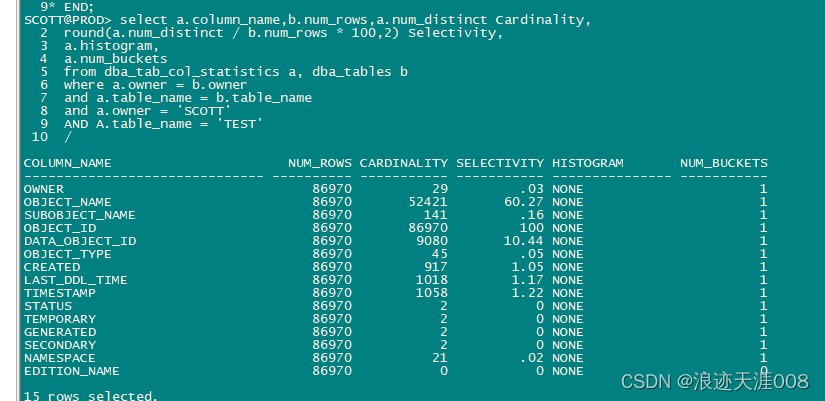下面的脚本看TEST表中每个列的基数和选择性。