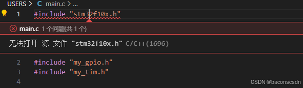 刚上研究生,在写嵌入式程序过程中总是被旁边cs专业的同门吐槽keil5界面难看,遂研究用vscode联合keil5开发单片机,不得不说,vscode写起代码确实顺手不少,代码自动补全和ai功能也让开发效率提升很多,如何在vscode中配置适用于嵌入式开发的环境教程已经非常多,这里不再赘述,但是在导入工程之后遇到了如下图所示的情况,无法打开stm32f10x.h源文件:
