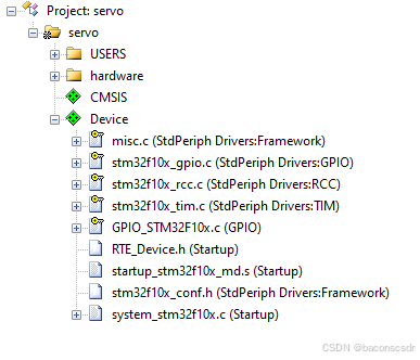 这样的工程在导入到vscode中就会报错,找不到头文件。这种创建工程的方式比较方便但只适合自己开发,别人在拿到这样的工程文件夹有可能会用不了,因为没有在keil中正确设置和包含库函数以及头文件(这种创建工程的方法当时是学校老师教我们的,可能是比较官方?)后来自学的时候发现网上创建工程时都跳过了Manage run-time environment的配置,直接将相关的库函数,启动文件等只读文件全部复制到了工程文件夹里,具体的步骤可以搜江科大的stm32教程,这样做工程栏大概长这样: