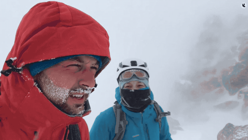 提示词:两位身穿鲜艳功能夹克的山地探险者,脸上结着冰霜,目光紧张专注,在雪地中轮流大喊