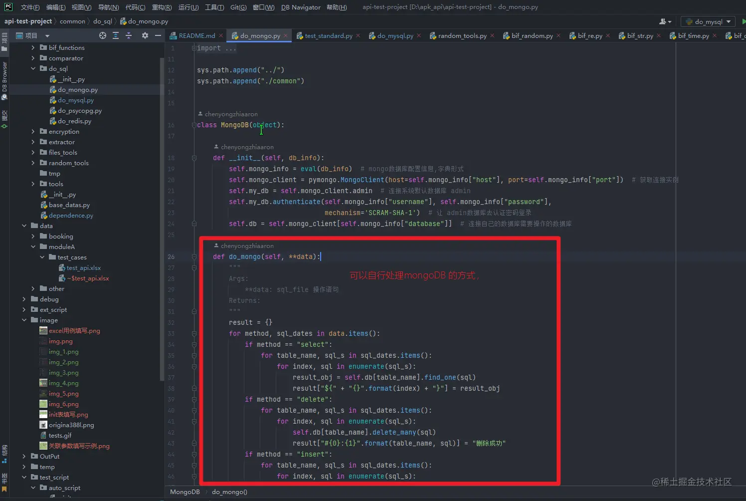 目前内置有多种数据库查链接方式,但是尚未使用起来,只是将mysql使用起来了,使用者如需要使用其他如 mongoDB 这类数据库, 可以按 mysql 设计的方式去扩展这个数据库以适应 excel测试用例编写方式,也可以联系作者处理