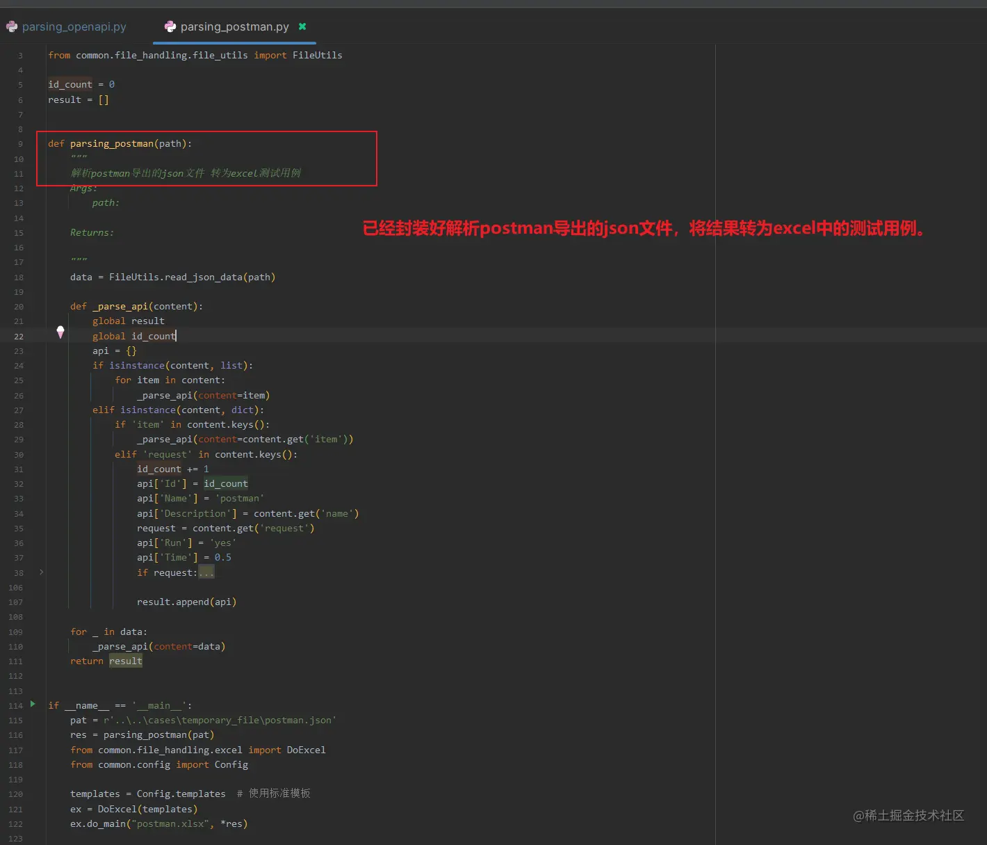 本框架已经封装好了解析函数,直接将postman文件导出,放到指定目录 运行excel_converter.py文件,即可得到测试用例 非常快捷省事,不用一条一条复制粘贴
