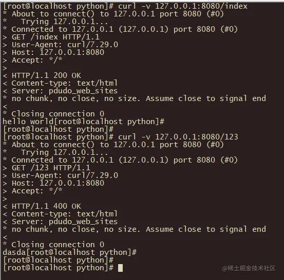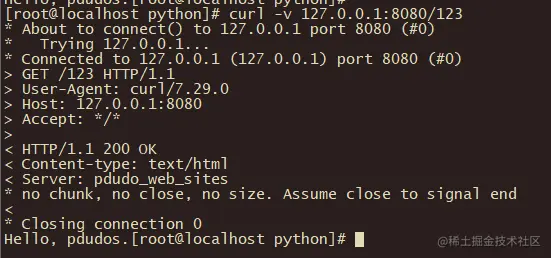 启动后,我们使用curl -v 127.0.0.1:8080/123可以得到如下信息: