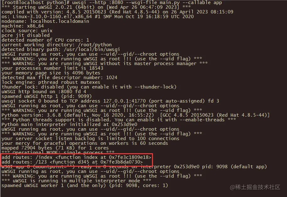 启动后,我们可以观察一下,我们之前在框架Routes函数中,我们打印了路由和函数的信息,我们可以看下uwsgi输出的信息,是有有我们定义的函数。