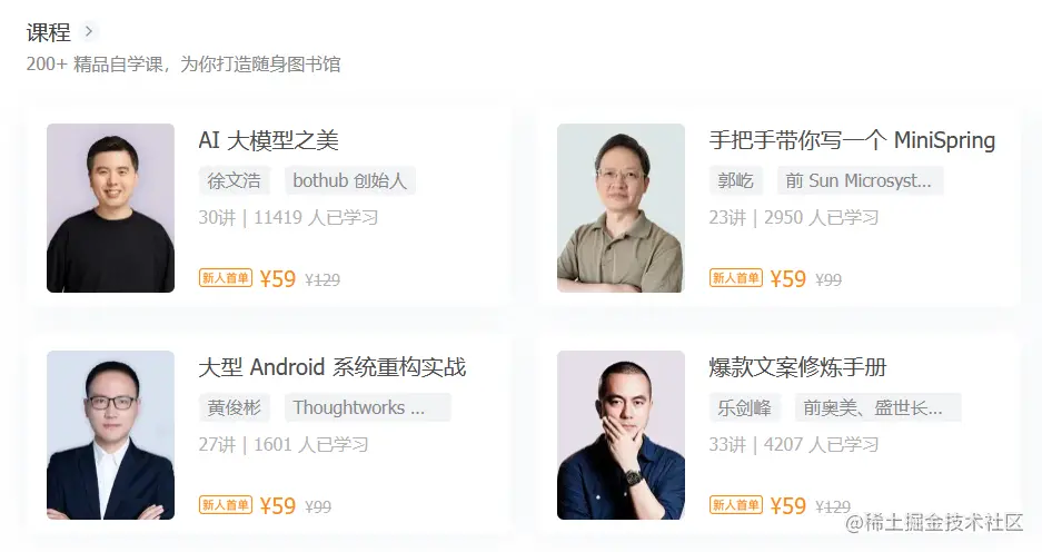 极客时间、掘金小册、慕课网……非常多技术社区都推出了付费专栏,除了内容创作者自发上传的零散内容,一般也有这种成体系的、可以系统性掌握一部分技术的课程,大多数价格不高,一般在百元以内,正因为如此付费门槛也很低,用户乐意为此支付。这种付费专栏如果是线上分成形式,相当于是一个一劳永逸持续入账的项目。