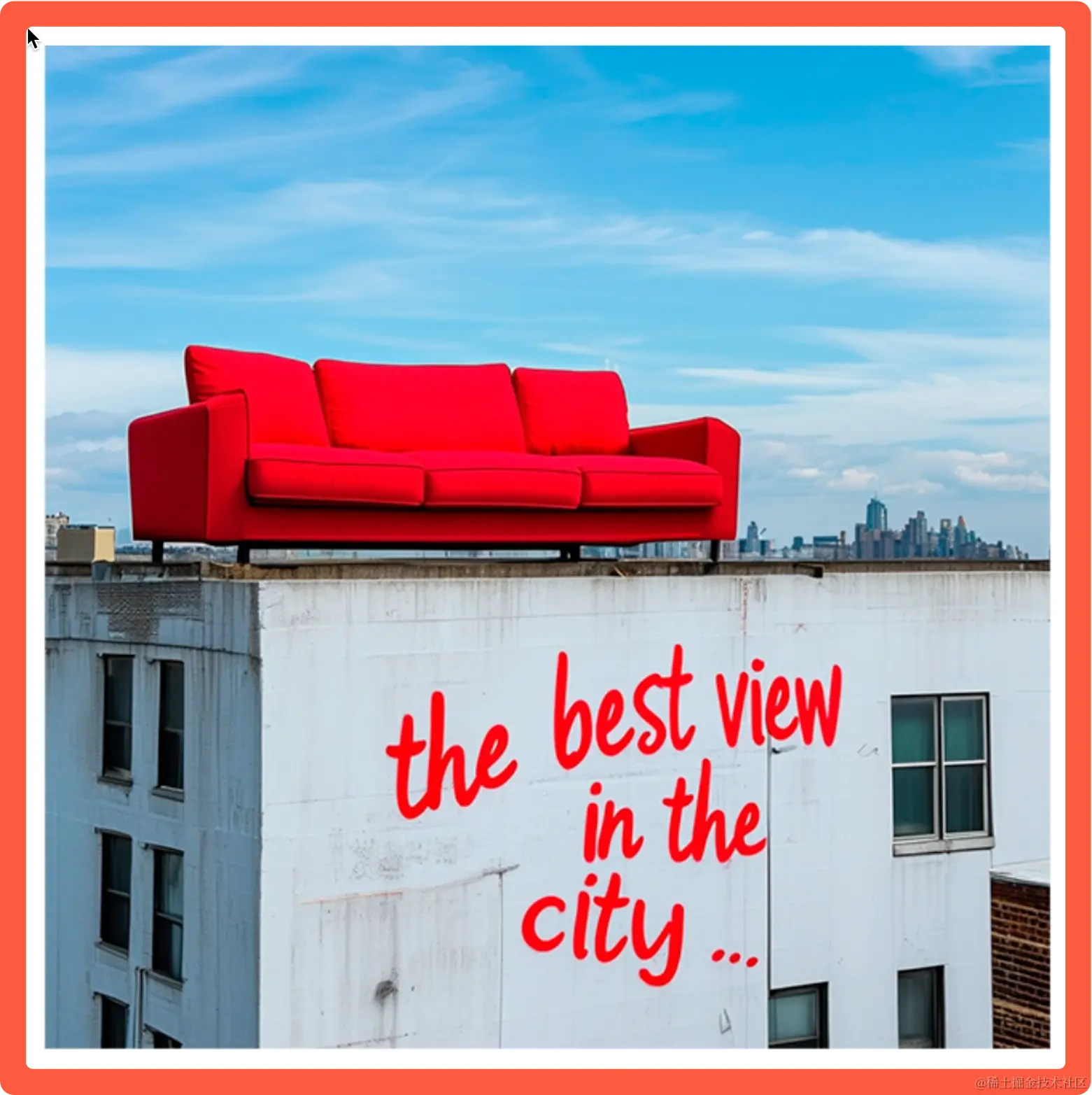 prompt: A red sofa on top of a white building, Graffitiwith the text "the best view in the city"