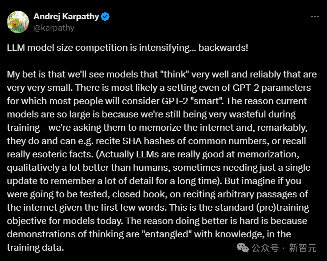 Karpathy预测这一趋势将持续下去。他写道,「我敢打赌,我们会看到很多能够有效可靠思考的模型,而且体积非常小。」