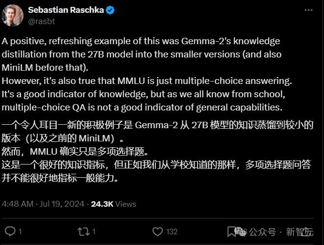 《Python机器学习》作者Sebastian Raschka认为,这就像是知识蒸馏,从27B的大模型蒸馏出Gemma-2这样的小模型。