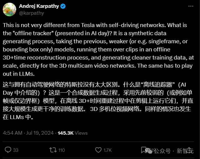 Karpathy预计,每个模型都会不断改进,为下一个模型生成训练数据,直到出现「完美的训练集」。