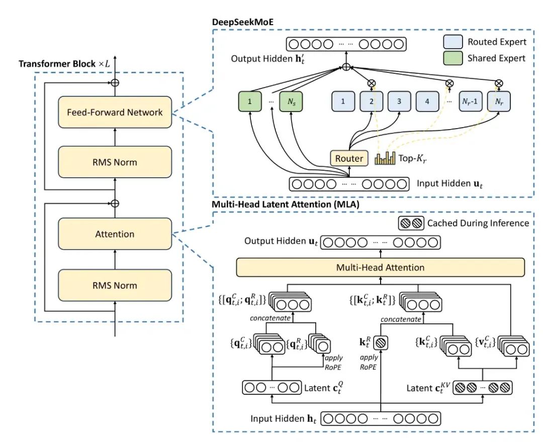 而最后一个MLA ,只需要少量的 KV 缓存,相当于只有 2.25 组的 GQA,但却能获得比 MHA 更强的性能。不过没法直接使用ROPE倒是一个弊病, 需要做一些改动。虽然MLA会增加一些计算,但是推理速度无疑是很快的