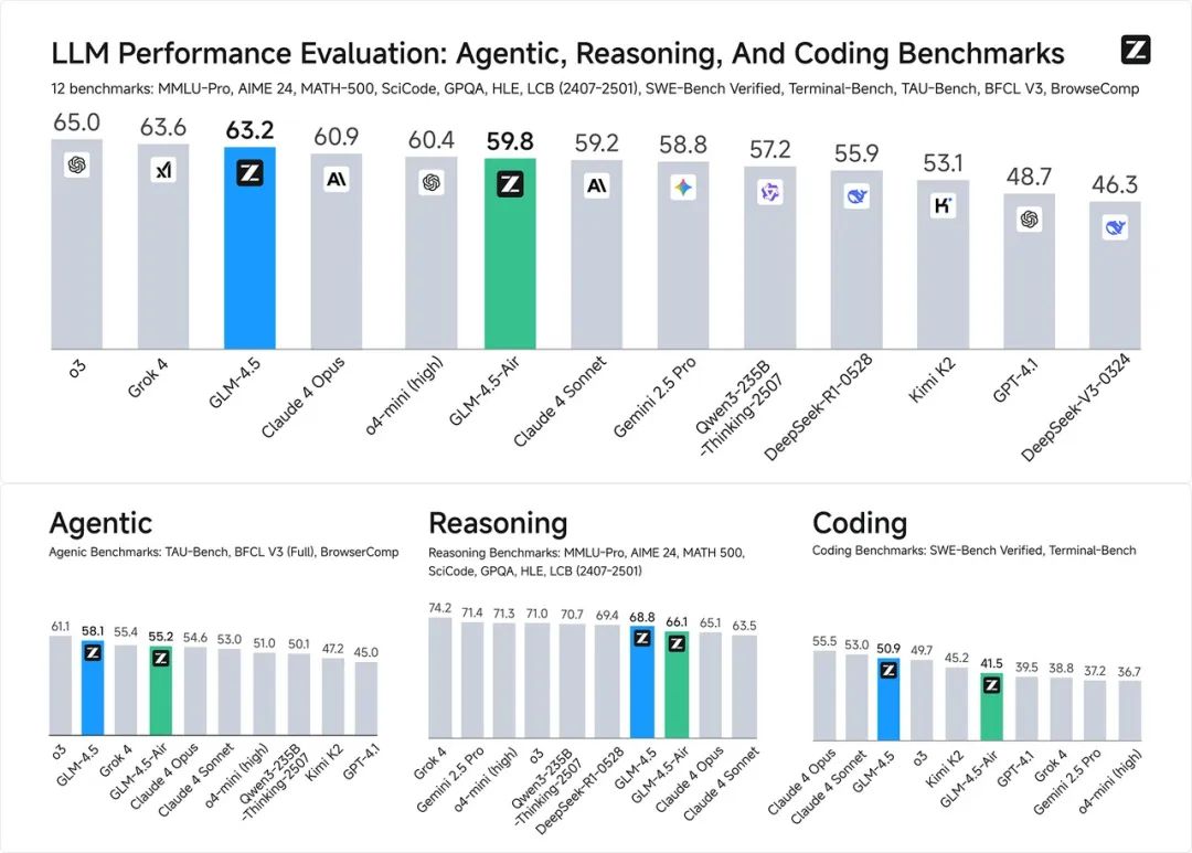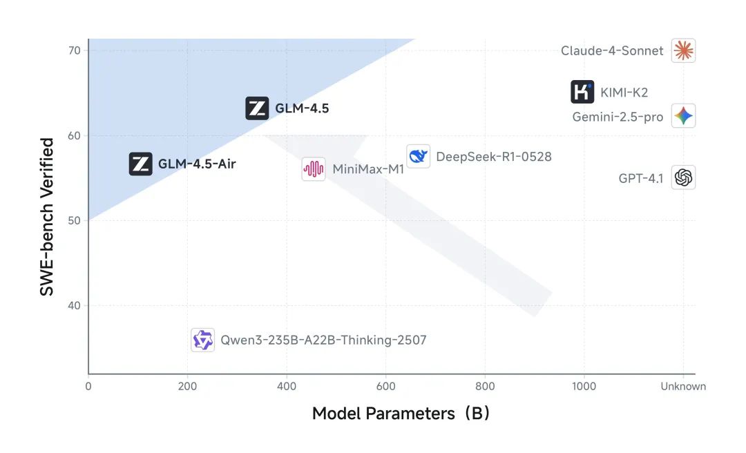 GLM-4.5 的总参数量仅为 DeepSeek-R1 的 1/2、Kimi-K2 的 1/3,却在多项权威基准测试中表现得更为出色。