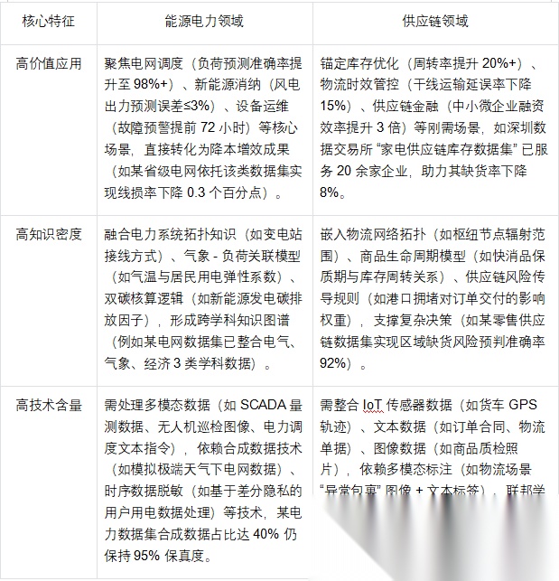 高质量数据集并非传统意义上经过数据质量治理后的“海量业务数据的堆砌”,而是契合行业场景需求、具备 “高价值应用、高知识密度、高技术含量” 三高核心特征的结构化数据资源,在能源电力与供应链领域呈现出鲜明的行业属性。