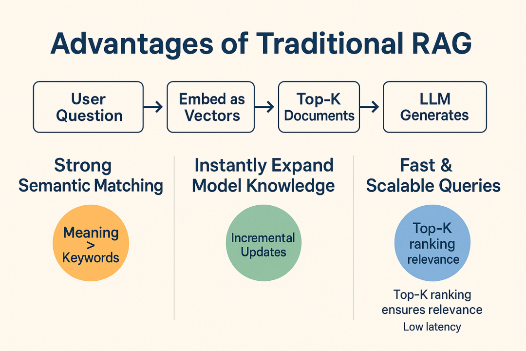 优势:传统RAG方法简单有效,是当前业界应用最广的方案。其优点在于:首先,语义匹配能力强。通过向量表示,模型能基于含义而非关键词找到相关内容。这使用户不必精确记忆知识库里的措辞,用自己的语言提问也能检索到答案。例如,上述向量检索能跨越不同表述找到同一概念的资料。其次,RAG可以即时扩充模型知识。当有新文档加入,只需更新向量索引,模型就能检索并利用最新信息回答问题,这解决了LLM训练后知识固化的问题。此外,向量数据库经过优化,查询速度快,能应对大规模知识库,并支持Top-K排序确保返回最相关内容。