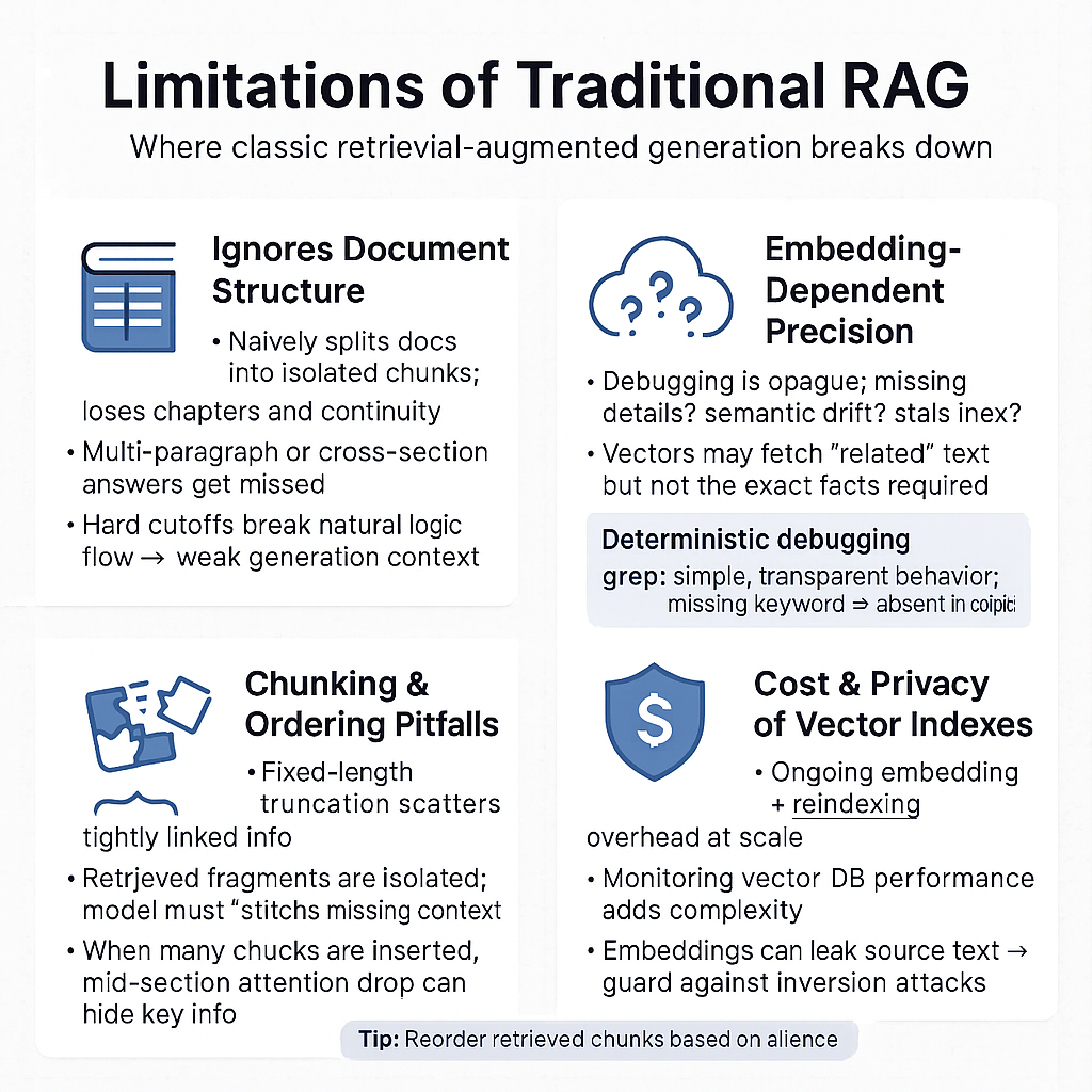局限:然而,基础RAG系统也存在不少不足。首先,忽视文档结构。经典RAG将文档机械地切成独立片段,丢失了章节层次和上下文连贯性。如果答案涉及多个段落关联或跨章节的信息,简单的相似度检索往往顾及不到。将长文档硬切会破坏其自然逻辑flow,导致模型生成时缺乏重要上下文。其次,检索精度依赖嵌入质量。当向量匹配失灵时,调试问题常变成噩梦——究竟是嵌入向量没表示出关键细节?语义空间偏差?还是索引过期未包含最新内容?。向量检索有时匹配的是大致相关的段落,却未必包含问题所需的具体事实。相反,传统关键字搜索(如grep)行为简单可预期:搜索不到某关键词,就说明文档里没有,这种确定性在诊断检索问题时非常宝贵。再次,段落截断与顺序问题也会影响效果。RAG常按固定长度截断文本,可能把紧密关联的信息分散在不同片段中,导致检索返回的碎片各自孤立,模型难以拼凑完整答。而当检索返回多个片段时,如何排序放入Prompt也有讲究。如果关键内容被排在中间,模型注意力可能不足,出现“中段遗失”现象,大幅降低答案准确率。最后,维护大规模向量索引也有成本与隐私问题:定期嵌入新数据、监控向量库性能都增加复杂度;向量可能泄露原文信息,需要防范embedding反推原文的风险。