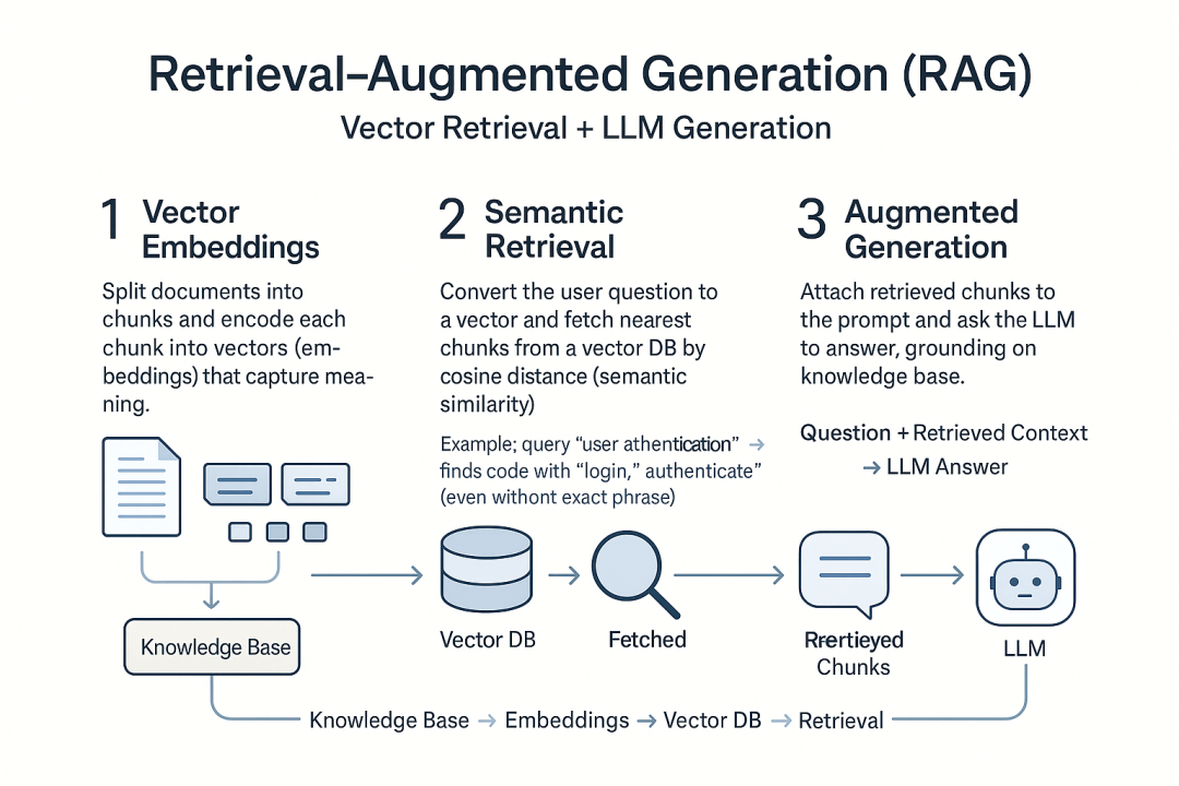 增强生成:将检索出的相关文本段一起附加到用户提问上,发送给LLM。模型在这些“提示”基础上生成答案,从而引用知识库信息,提高准确性。
