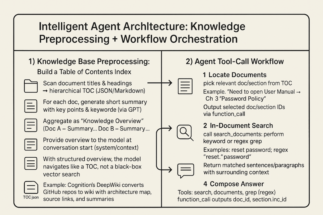**1.**知识库预处理:构建目录索引。为了让模型理解文档结构,我们需要提前准备好知识库的目录或摘要信息。具体做法可以是:扫描所有文档的标题、章节,生成一个层次化的目录JSON或Markdown文件。对每个文档,我们也可以让GPT生成一段简要摘要,标注主要内容和关键词。这些信息汇总成“知识总览”(例如一个清单:文档A - 概要…,文档B - 概要…)。在对话一开始,将这个总览提供给模型(作为系统消息或上下文的一部分),让它对知识库“心中有数”。例如,Cognition的 DeepWiki 工具就会将GitHub仓库自动转换成带架构图、源代码链接和摘要的Wiki页面,帮助开发者(和AI)快速理解仓库结构。有了结构化总览,模型就能像翻目录一样快速定位可能相关的文档区域,而不是在黑箱向量空间里盲目搜索。