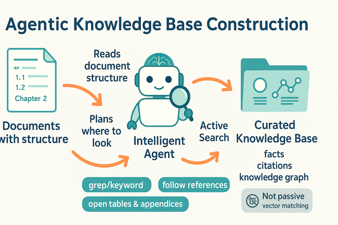 针对上述局限,我们发现利用智能****Agent(智能体)的方法构建知识库,即赋予大模型类似人类研究员的能力:让它主动“阅读”文档结构,自己决定去哪里查找信息,而非被动依赖向量匹配。其核心思想包括: