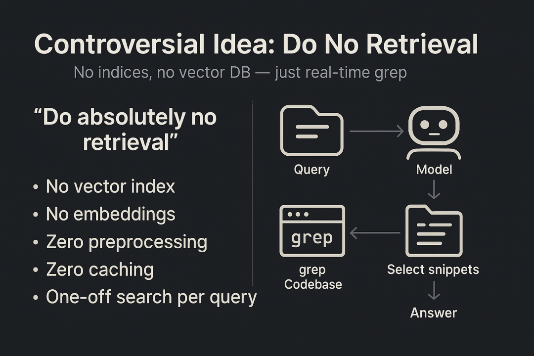 有趣的是,Claude Code 团队的实践引出一个颇具争议的理念:“完全不做任何检索”。所谓“不检索”,并非指AI凭空作答,而是指不构建专门的检索索引和数据库,一切信息获取都依赖实时读取和模型自身。这在ClaudeCode中体现为:没有向量索引、没有代码片段Embedding,Claude每次回答问题时都现用grep从源码中查找需要的内容。换言之,零预处理,零缓存,一次一查。