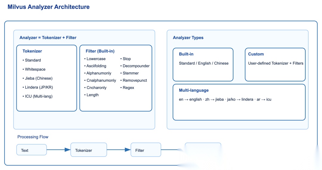 从图中可以看出,Milvus Analyzer 的整体处理流程可以总结为:原始文本 → Tokenizer → Filter → Tokens。