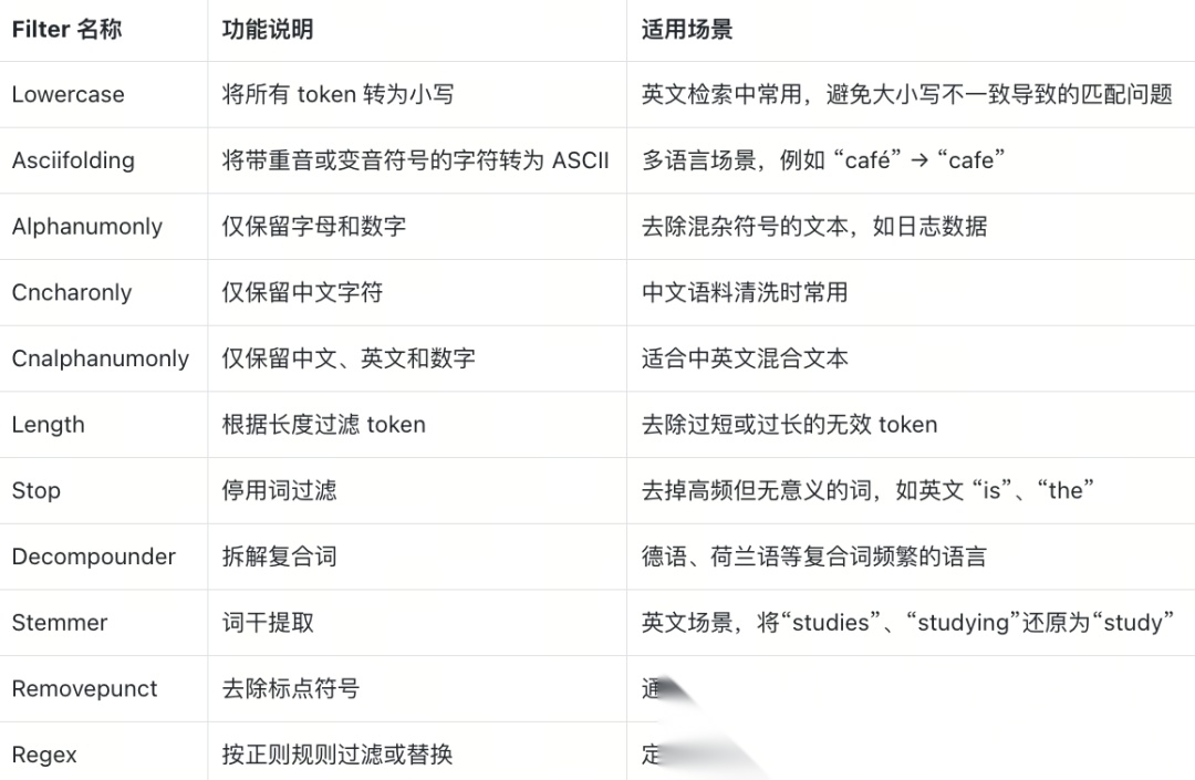 如果说 Tokenizer 是把文本切开的刀,那 Filter 就是刀后面的精修工序。在 Milvus Analyzer 中,Filter 的作用是对切分后的 token 进行进一步的标准化、清洗或改造,让最终的 token 更适合用于检索。